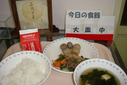 今日の献立は,「ごはん・牛乳・牛肉のしぐれ煮・里いもの煮つけ・豆腐の吉野汁」でした。今日は,お月見の行事献立です。