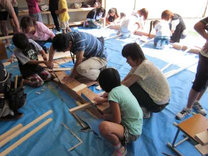 9月11日(日)本校ピロティにて建築組合の「葭塾(よしじゅく)」の若手メンバーの方々に教えて頂き,『親子木工教室』を行いました。集まったのは1年生から6年生までの児童60名以上。3年生以下は保護者同伴ということもあって100人近くがピロティに集まり,オリジナルのイス,物入れ等の製作を行いました。初めてのこぎりを使ったという子もいましたが,「どうすればうまく作れるかな?」と考えたり話し合ったりしながら木工製作をしていく,とても楽しい時間になりました。