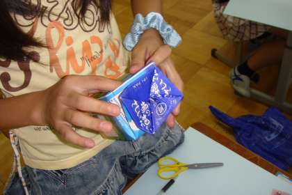 夏休み中に女性会の方に教えていただいたという牛乳パックで箱を作る児童もいました。