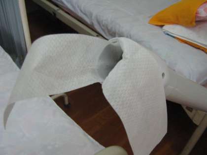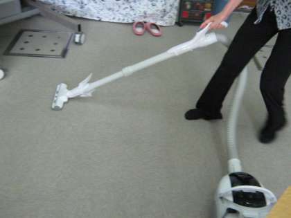 学校では、子どもたちの健康のために、カーペットのある部屋や保健室の布団のダニの検査を学校薬剤師の先生にしてもらっています。写真のように掃除機の吸い込み口に検査用フィルターをつけてカーペットや布団を掃除機で吸い、検査用フィルターを検査機関で調べてもらいます。