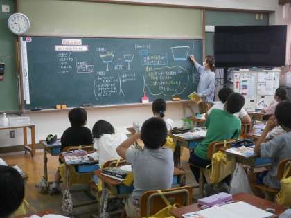 「水は空気中にでていくのだろうか」という問題を解決するために,水を入れた入れものを使って比べながら調べました。一つはラップをし,もう一方はラップをしないで日なたにおいておきました。実験の結果,ラップをした入れものでは,ほとんど水が減らず,入れ物の内側に水がたくさんついていました。ラップをしていない方は,水が減っていました。結果から,水は空気中に出ていくことをみんなで確認することができました。