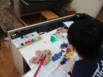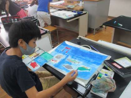図画工作科で取り組んでいるお話の絵が完成に近づいています。自分の思いを絵に表すにはどうしたらいいか,考えながら絵を描いています。絵の具だけでなく,コンテ,色鉛筆,クレパス,色ペンなどさまざまな画材があります。どの画材を使うことで自分が表したい表現にできるか工夫している姿は,さすが高学年だなあと感心しました。