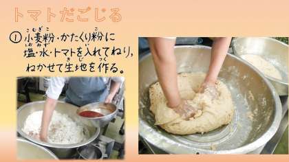 給食では,小麦粉・片栗粉・塩・水とホールトマトを練りこんで,ねかした後,生地をスプーンですくって1つ1つ釜に入れていきました。だんご以外の具にも小さく切ったトマトが入っていましたが,「これなら食べられる!」とトマトが苦手な子どもも食べてくれていました。