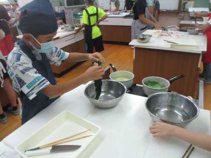 今週の家庭科は調理実習を行いました。作ったものは,ほうれんそうのおひたしです。初めての調理実習でしたが,手順を確認し,手際よく進めることができました。自分たちで作ったおひたしの味は,格別でしたね!!あっという間に完食しました。