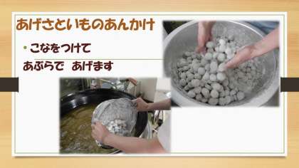 里いもに下味をつけた後,米粉をつけて揚げます。別の釜でかつおだしをベースに,鶏ミンチと彩りの枝豆を加えて「あん」を作りました。揚げた里いもに,だしのきいたあんをかけていただきました。里いもが苦手な1年生も,「あんといっしょなら食べられた!た!」と喜んでくれていました。