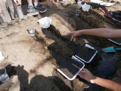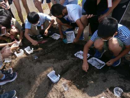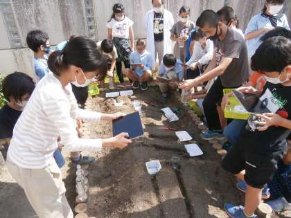 流れる水にはどのようなはたらきがあるのかを調べるために,学校園の畑で実験を行いました。
