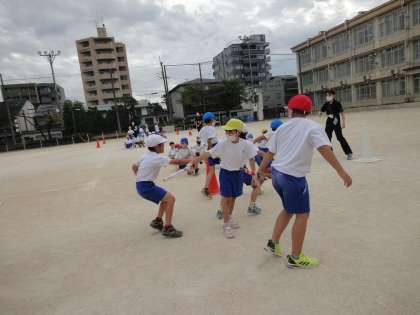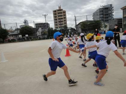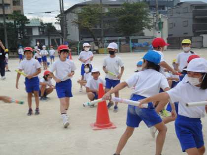 いよいよ来週が,本番のスポーツフェスティバルです。今日もリレーの練習をしました。バトンのつなぎ方もだいぶ慣れてきました。自分で作ったバトンをうまくつないで,少しでも速くゴールできるようにがんばっていました。