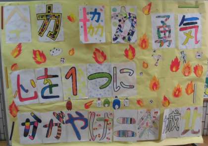 児童会が中心となってスポーツ・フェスティバルのスローガンを募集し,決まったスローガンを掲示できるよう,学級ごとに手分けしてポスターを作りました。今日の中間休みに玄関に掲示すると「わー」っと歓声が上がりました。「全力・協力・勇気 心を1つにかがやけ二条城北!」