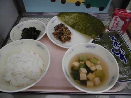 ・ほうれん草のおかか煮がつるつるしておいしかった。すまし汁のとうふが,たくさん入っていて,おいしかった。肉みそ納豆は,ポリポリしておいしかった。(1年2組)