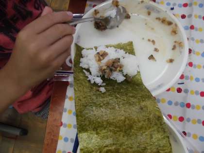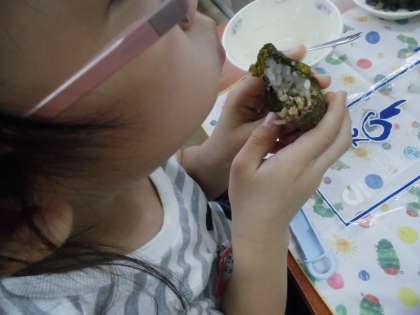 『肉みそ納豆』は,ひき割り納豆と牛ミンチ・たまねぎ・九条ねぎを炒めて,みそやトウバンジャンなどで味つけて仕上げました。食べるときに,手巻のりにごはんと肉みそ納豆をのせて,巻いたり包んだりして食べました。納豆の苦手な子も,おいしく食べられたようです。