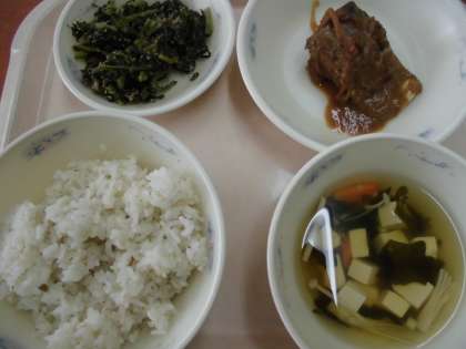 麦ごはん・さばのみそ煮・だいこん葉のごまいため・五色のすまし汁