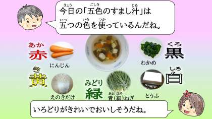・五色のすまし汁をみて,とてもいろどりがきれいでした。ビデオを見て,和食はいろどりが大切なのがよくわかりました。(3年2組)