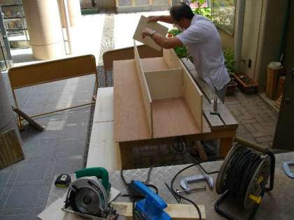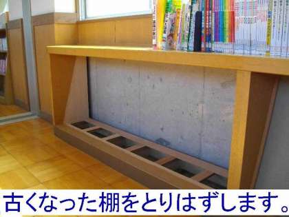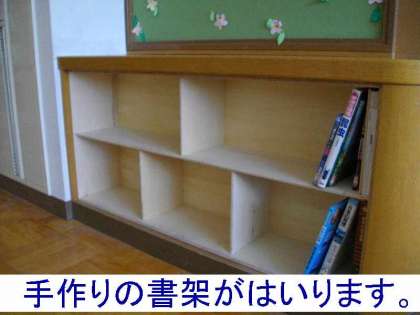 毎週火曜日には保護者ボランティアの方々にお世話になり,本の整理を進めていただいています。また,その本を入れる書架は,管理用務員が,一つ一つ制作しています。