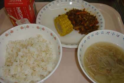今日の献立は,「玄米ごはん・牛乳・和風ドライカレー・カットコーン・スープ」でした。