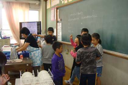 カットコーン・・・食べやすい大きさに切られたとうもろこしを給食室の釜で蒸して います。2年生の教室では,カットコーンのおかわりにたくさんの子どもたちが手を上げ,じゃんけんをしていました。