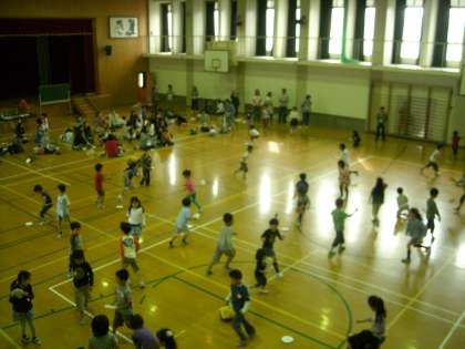 作った後は,体育館でみんなで飛ばしました。「すごい!」と歓声が上がり,飛ばすのにみんな夢中になりました。「くるくる回って遠くまで飛んだよ。」と自分のフリスビーを得意げに見せる子もいました。みんなが楽しめた新聞フリスビー作りになりました。準備等いろいろお世話になり,本当にありがとうございました。