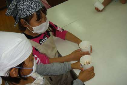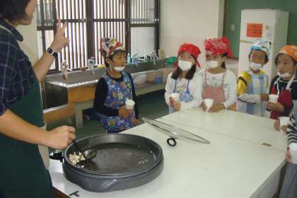 実がはじける音やバターのにおいを楽しみながら,できあがるのをまちました。実がはじけるたびに歓声が上がっていました。