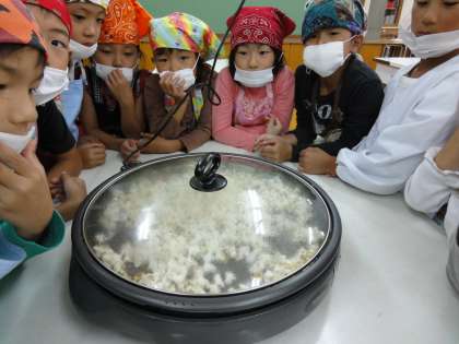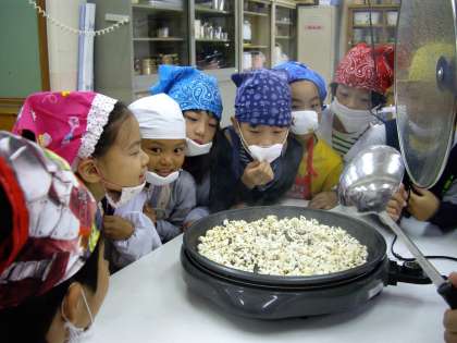 5月から育てていたとうもろこしが,黄色い実をつけました。2メートル以上に育った茎を見て,びっくりしていました。採れた実で,ポップコーンを作りました。家庭科室で,ホットプレートを使って作りました。バターと実を入れたホットプレートのまわりに顔を寄せ合い,はじける様子を見つめていました。はじめの1つが,はじけるとみんなの顔がにっこり。ポンポンと音を立てて,はじける様子を楽しんでみていました。少しこげた塩味のポップコーンをおいしそうに食べていました。次は,サツマイモの収穫です。