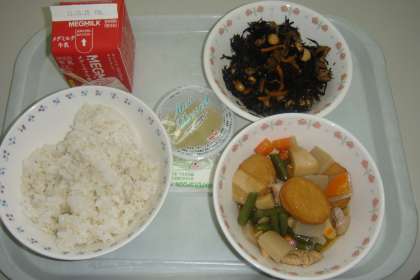 今日の献立は,「麦ごはん・牛乳・平天とこんにゃくの煮つけ・ひじき豆・りんごゼリー」でした。