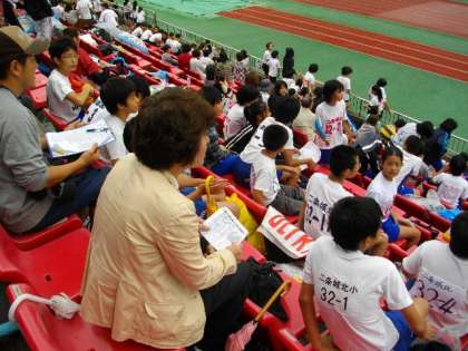 京都市小学生陸上記録会が西京極陸上競技場で開催されました。時折小雨が降り,やや肌寒い一日となりましたが,二条城北小学校からは6年生男女20名が100m走や800m走などの競技に参加しました。