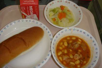 今日の献立は,「ミルクコッペパン・牛乳・大豆と鶏肉のトマト煮・野菜のホットマリネ」でした。