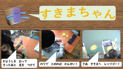 完成したすきまちゃんは,教室の中のいろんなすきまからひょっこり顔を出し,みんなの様子を見ていました。子どもたちは,タブレットを使って,すきまちゃんの写真を撮りました。こんなところにもすきまがあったのかと,驚かされるくらい,子どもたちはいろんなすきまを見つけて楽しんでいました。