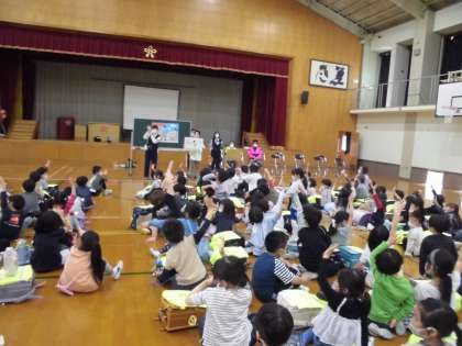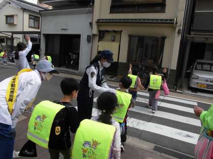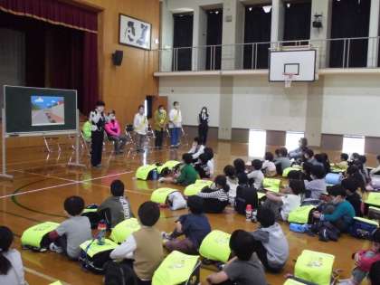 今日は上京警察署の方や地域の安全推進委員の方々に来ていただき,交通安全教室を行いました。道を歩いている時の危険や気を付けるべきところを教えていただきました。下校の際には,学んだことをさっそく実践し,自分の目で左右を確認し手を挙げて渡るなどして帰っていました。