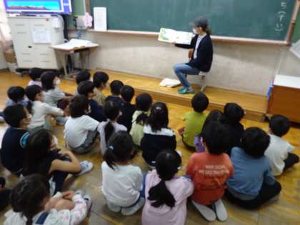 今日は,朝チャレンジの時間に地域の方の読み聞かせがありました。みんな,はじめての読み聞かせに興味津々でした。これから,毎週水曜日の朝にきていただけるので,とても楽しみにしています。読み聞かせしていただいた本をきっかけに,いろんな本を手に取って読んでほしいです。