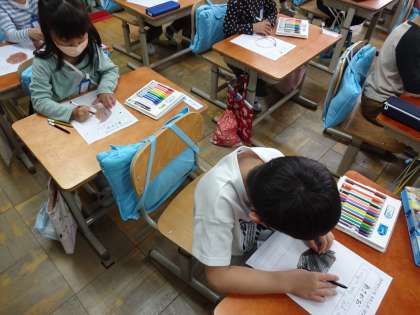 生活科の時間に,アサガオの種を観察して「見つけたよカード」にかきました。とても小さな種ですが,よく見ると,丸いところや平べったいところがありました。また,色も黒色やこげ茶色に見えるところだけでなく,白っぽく見えるところもあることに気付いていました。次の生活科の時間に,種を植えます。どんなアサガオの花がさくのでしょうか。みんなわくわくしています。
