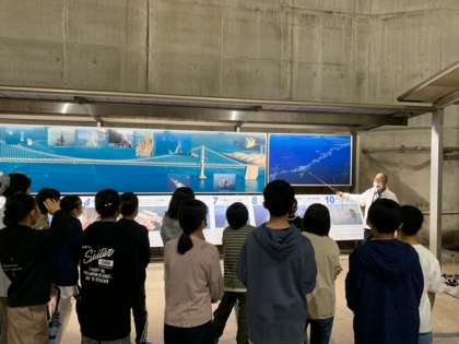 瀬戸大橋のアンカレッジの中に入って、ガイドの方に瀬戸大橋についてたくさんのことを教えていただきました。約10年かけて、800万人以上の人の手でつくられたこと、1兆円以上のお金をかけてつくられたこと、瀬戸大橋が開通されて物流や人との交流が盛んになったことなど、たくさんのことを学ぶことができました。自分から質問する子もいてとても熱心に学ぶ姿も見られました。