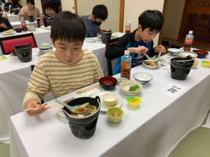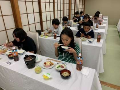 入館式終了後は美味しい夕食です。うどんとご飯はおかわり自由ということでどんどんお代わりする子が多かったです。今のところ、体調不良を訴える子もおらず、順調に活動が進んでいます。