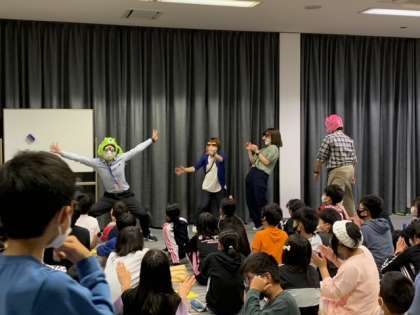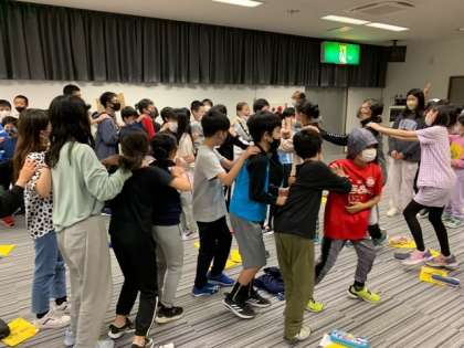 レクリエーション大盛り上がりで終わりました。最後には二条城北小学校の6年生のために、特別ゲストも来てくれました。今から振り返りをして明日に備えます。