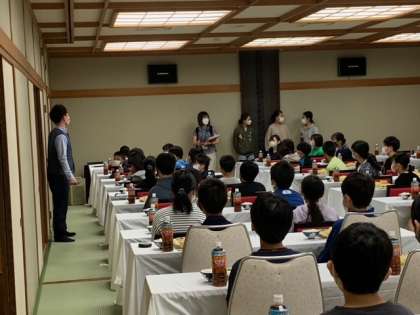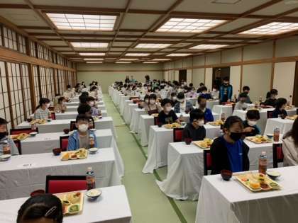 朝食の前に、退館式を行いました。100人ほどが集まっていますが、係の人の声で、凛としたムードを作り、感謝の気持ちを届ける素晴らしい式になりました。