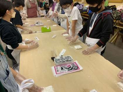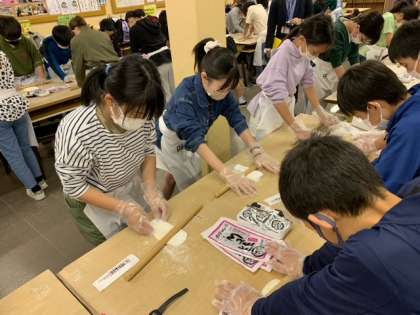 うどん作りが始まりました!うどん学校の先生のお話をしっかり聞いて、一つ一つの作業を丁寧にかつ大胆に行っていきます!