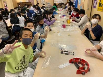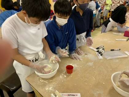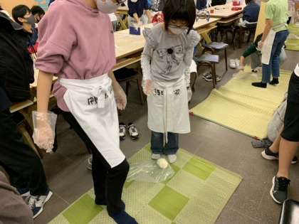 2時間目は粉からうどんの生地を作りました。こねて、踏んで、切って、みんなで協力したうどん。このうどんも持って帰ります!