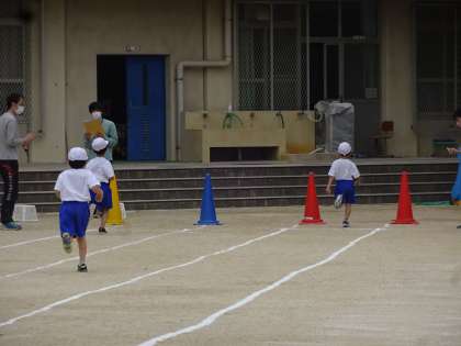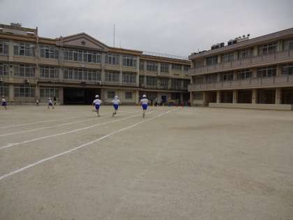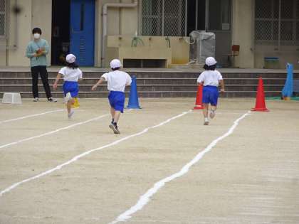 体育科の学習で50m走のタイムを測りました。「位置について,用意,ドン。」の合図でしっかりと直線距離を走りぬくことができました。