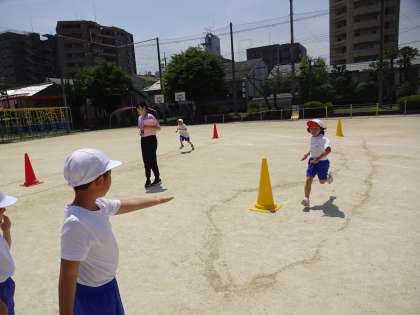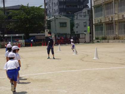体育科「リレーあそび」では,「くねくねリレー」に挑戦しました。コースに置かれたコーンをよけて走り,次の人にバトンタッチします。みんなコーンを上手に回って走るこができていました。今度はもう少し難しいリレーにも挑戦します。