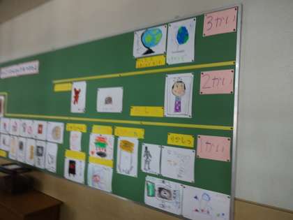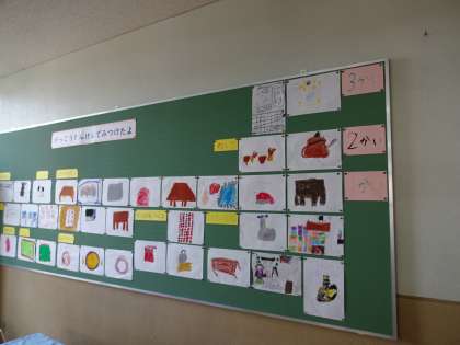 1年生の教室前の掲示板には,生活科の学校たんけんで見つけたものの絵カードが貼ってあります。みんなたくさんのひみつを見つけてきました。「学校のいろいろな部屋のことはわかったけれど,知らない名前の先生がいたよ。」「まだまだ知らないことがいっぱい。」「もっと先生と話してみたいな。」そんな声が聞こえてきました。