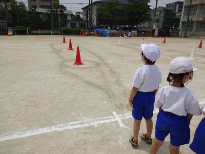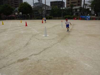 体育科の「リレー遊び」では,「ぐるぐるリレー」に挑戦しました。前回の「くねくねリレー」より少し難しくなっています。コースに置かれた3つのコーンのうちの2つのコーンの周りをぐるりと回ってから3つ目のコーンを折り返してきます。初めは,走り方が分かりにくい子もいましたが,慣れてくると上手にコーンを回って競走を楽しんでいました。