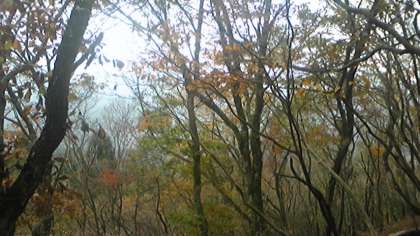 木々の間から山の家が見えました。少し雨が降ってきましたので,レインコートを着て登っています。頂上を目指して,がんばれ!