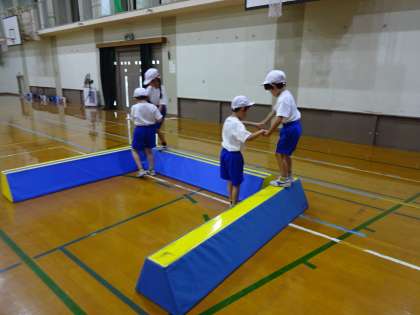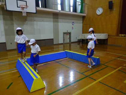 雨だったので,体育館で平均台を使った運動をしました。まっすぐ 歩いたり,かにさん歩きをしたりして楽しみました。友達とペアになって手をつなぎ,落ちないようにバランスよく平均台の上を歩くことができました。