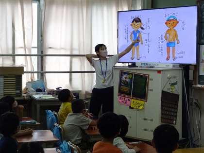 いよいよ体育科で「みずあそび」が始まります。今日は,「みずあそび」に向けての準備や心構え,着替え方やプールでの合図などについて事前にスライドを使って学習しました。体調を万全にし,ルールを守って安全に楽しい「みずあそび」の学習をしていきたいです。