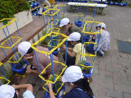 みんなで調べてみると,「支柱を立てて,ひもでくくるといい」ということがわかり,みんなで取り組みました。
