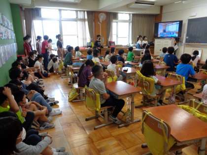 「6年生の修学旅行の思い出を聞いてみたい」そんな3年生の思いを受けて,6年生が修学旅行の思い出を話しに3年生の教室に来てくれました。