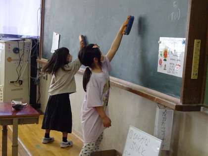 今週から,1年生も自分たちで教室のそうじを始めました。ほうきのはき方,ぞうきんの絞り方,机運びなと,色々と覚えることがあって大変ですが,少しずつできることから頑張っています。ピアサポートの5年生も見守りに来てくれて,困っている時は助けてくれています。5年生,ありがとう!