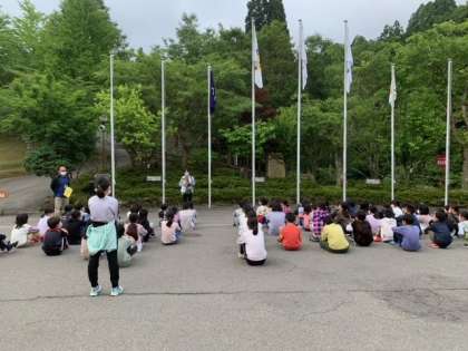 山の家の澄んだ朝の空気を吸いながらみんなで集まりました。今日のテーマ、信頼と団結をみんなで確認して、2日目の活動がスタートしました。