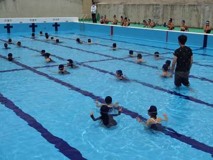 今回の「みずあそび」は,2組と3組です。「かにさん」や「あひるさん」に加えて,「かえるさん」をやりました。しっかりひざを曲げ,手を底につけてジャンプします。口元まで水がきたら,ぶくぶくっと息を吐きました。顔を全部つけて「かえるさん」に挑戦ししている子もいました。