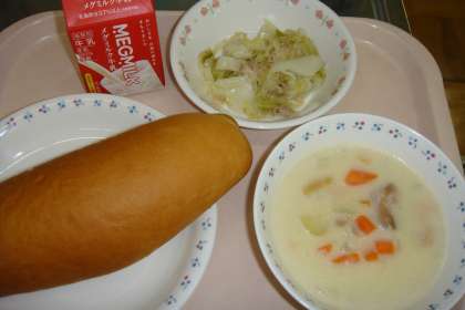 今日の献立は,「あじつけコッペパン・牛乳・じゃがいものクリームシチュー・ツナとキャベツのソティ」でした。