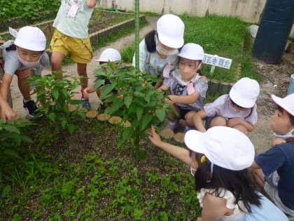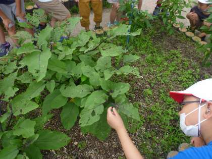 生活科の学習で,自分たちが育てているナスやピーマンの観察をしました。目でよく見たり,触ったり,耳を澄まして音を聞いたりしました。観察して発見した気づきをタブレットに入力し,クラスで交流しました。