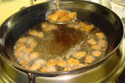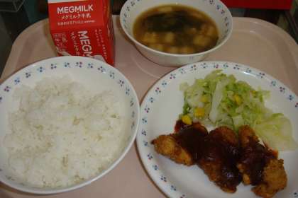 この献立は,給食感謝の献立で給食室で豚肉に1枚1枚ころもをつけ,油で揚げました。